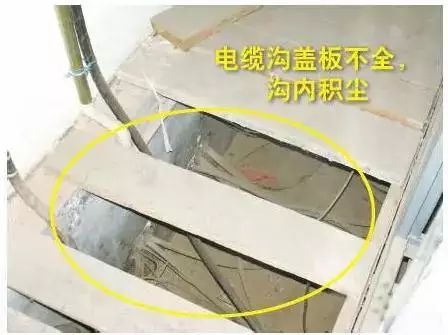 電纜溝蓋板不完整,溝內(nèi)積有灰塵。