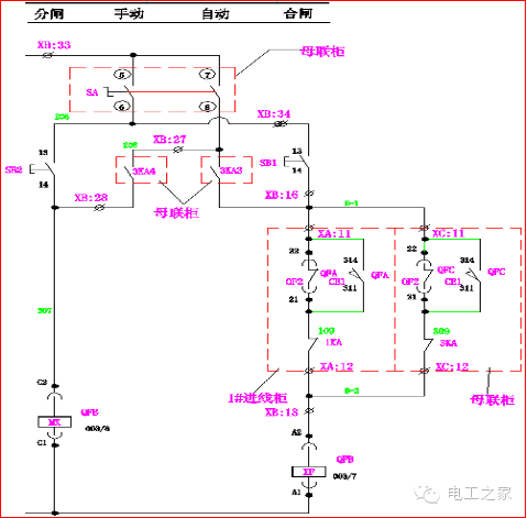 在手動操作中:10,000轉SA的1和2條腿連接在一起。當Q2和Q3閉合時,Q1閉合回路A-2和A-3斷開,其閉合線圈XF不能通電,Q1不能滿足閉合條件。同樣,當Q1、Q2或Q1、Q3同時接通時,Q2或Q3也不能滿足切換條件。使進線柜和母聯符合“三合一”的邏輯。